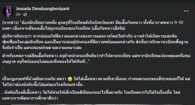 เมื่อวันที่ 1 ธันวาคม 2568 ผู้บริหารโรงเรียนแห่งหนึ่งในจังหวัดแพร่ เปิดเผยกรณีที่โรงเรียนยึดเสื้อกันหนาวของนักเรียนทั้งที่อากาศเย็นถึง 10 องศา โดยระบุว่าได้รับรายงานอย่างเป็นทางการเกี่ยวกับเหตุการณ์ จึงได้เรียกครูและนักเรียนมาหารือร่วมกัน
